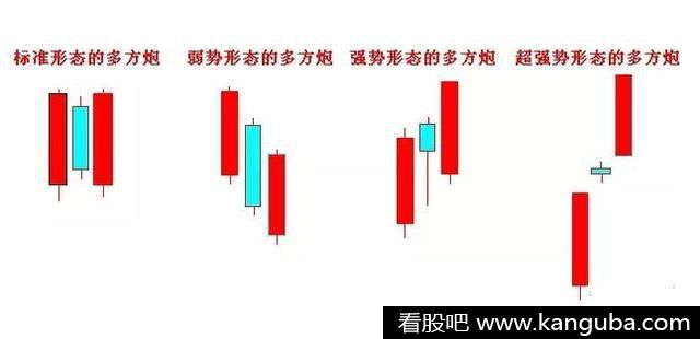 两阳夹一阴既是上涨中继信号,也是底部反转信号,技术特征主要有3点:1)它是由三根K线组合而成;2)第一天收出一个大阳线或中阳线,第二天下行收出一根实体与第一天差不多的阴线,第三天收出一根大阳线或中阳线,实现技术反包;3)两阳夹一阴存在技术变形,强势程度也不相同,如下图所示。