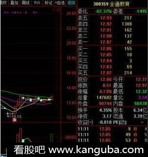 从图中可以看出:五矿稀土内外盘数据,外盘194590内盘153277,同时可以看到五矿稀土的股价当天是跌的;而全通教育的内外盘数据,外盘90744内盘56938,可以看到全通教育的股价当天是上涨的。