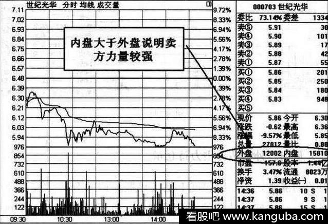 内盘,外盘这两个数据 大体可以用来判断买卖力量的强弱。若外盘数量大于内盘,则表现买方力量较强,若 内盘数量大于外盘则说明卖方力量较强。