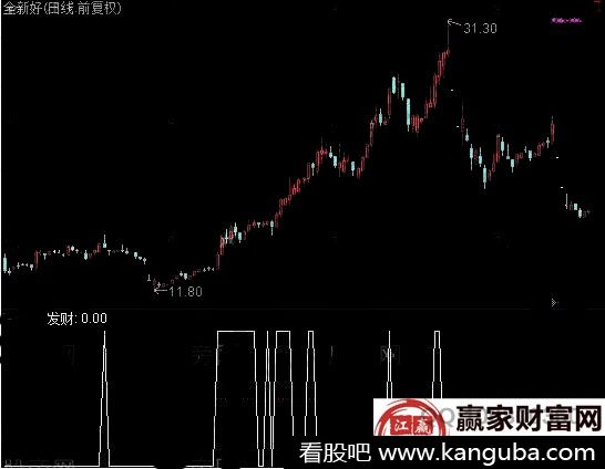 主要的是其发财线的走势变化,提示投资者介入点的位置,如图全新好股价的走势,从最低点11.80元向上拉升,上涨到最高价31.30元,股价翻倍,是典型的翻倍黑马股,投资者可以在发财线尖角的位置,及时的买入,下跌迹象出现之后,及时卖出。