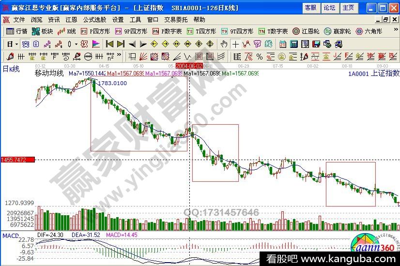 再比如2004年11月到2005年6月的上证指数走势变化,可以看出有三段下跌的趋势,其主要的特征表现在7日均线成为了反弹的阻力,当大阳线突破7日均线的时候,之后必然会遭到大阴线的打压,回到7日线以下的位置运行,这个时候投资者同样也需要注意股价的变化,是否会出现到底反弹的形态或者反转的走势形态变化。