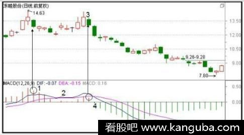 标注点2:红柱不断缩短,同时DIF与DEA形成了死叉,所对应的股价为阳十字星;