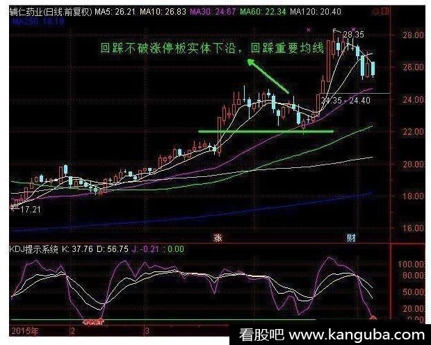 2、封涨停板之后,股价出现回调,不跌破涨停板阳线实体的下沿。