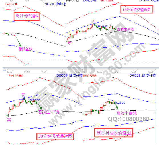 最后,将上述两点结合,明天是涨还是跌就很清楚了。我们以个股300369绿盟科技为例,先看日线分析图,该股当前刚好受制于极反通道蓝线的压力,1.382的时间收在蓝线压力下方,日线顶背离,且量能不济,看跌生命线的趋势。再看日内各周期:5分钟生命线下弱势看跌蓝线的趋势;15分钟回调生命线趋势;30分钟蓝线受阻看跌生命线的走势;60分钟同样回落生命线的趋势,则,不管是日线级别还是日内级别,该股都是明显的下跌趋势,那明日大概率就是跌。学会了吗?找到你的股票,同样的方法复制去做,就可以得到答案!