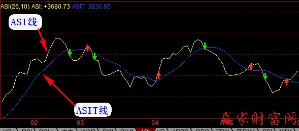 ASI指标是震动升降指标的简称,该指标是由两条曲线组成,其中波动振幅较大的称为ASI线,另一条波动相对平缓的称为ASIT线。如下图所示: