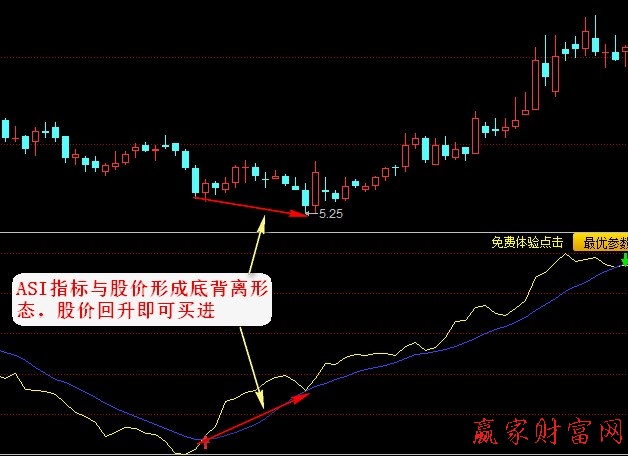 股价在经过一段时间的下跌后,股价价位已经很低,而且股价连续下跌,不断创出新低,而此时ASI指标却是开始回升,反而是一波比一波高,与股价形成底部背离形态。