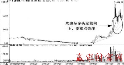 图1,观察月K线中均线的形态,从图中可以看出,在2010年12011年这段时间内,该股的月K线上均线都呈现出多头发散向上的状态,预示着股价将上涨,投资者应重点关注并择机买入。