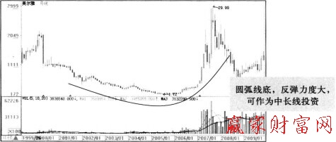 2.要关注月K线的形态,如果其形态呈现出矩形、圆弧底或双底形态时,表示这类个股筑底时间较长了,主力已经有了充足的时间进行底部换手,底部横盘的时间越长,主力在底部锁定的筹码就越多,股价反弹的力度也就越大。这类个股对于中长线投资者来说潜力较大,如图2所示。