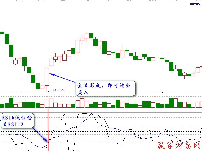 如下图所示RSI6上穿RSI12形成金叉后的走势情况,投资者在发现目标股出现该形态时即可积极建仓买进。