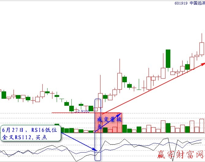 如下图,中国远洋(601919)的股价经过底部震荡整理后,于6月27日RSI指标出现RSI6上穿RSI12形成金叉走势,表明股价整理结束,多方力量将开始拉升股价,发出买入信号,投资者在该买点形成后,可积极买入股票。从该股后期走势可以看出,这波行情上涨空间很大。
